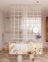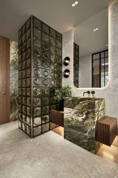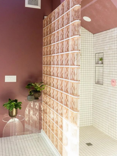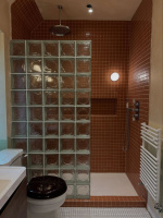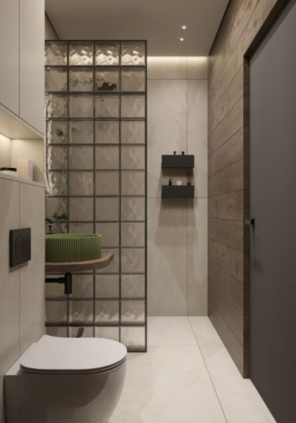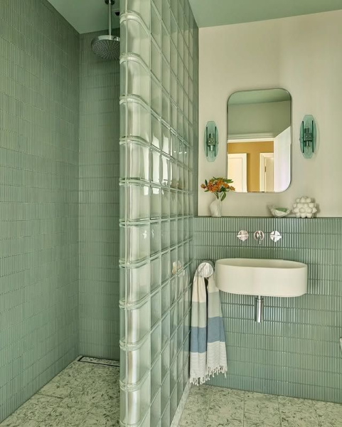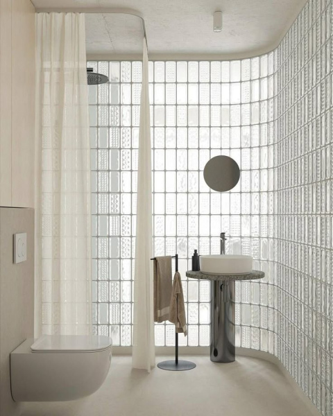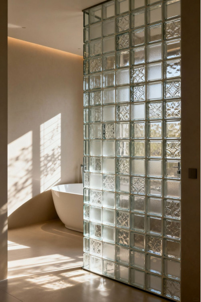 Nejtypičtější řešení, se kterým se setkáte, je luxfery sprchový kout – tedy sprchová stěna z luxfer místo běžné zástěny nebo jako pevná boční příčka. Je to funkční i designové zároveň: světlo prochází, ale zůstává pocit intimity.