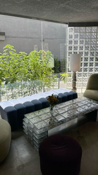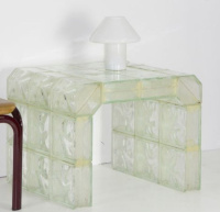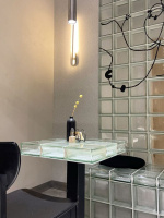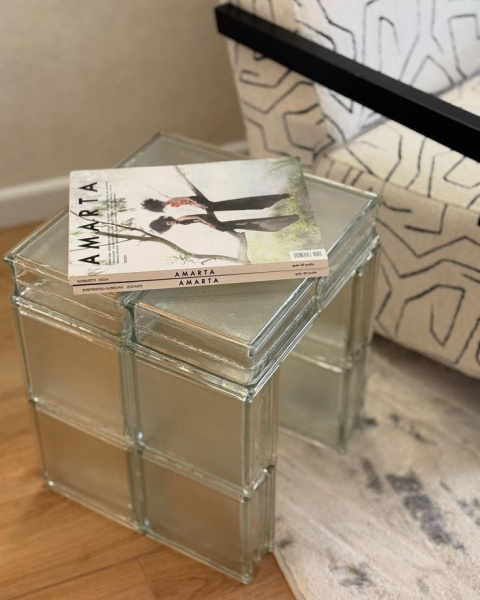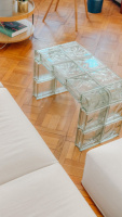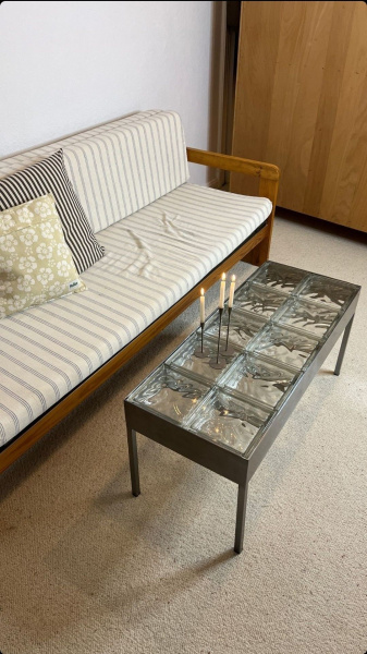 Stůl z luxfer není jen kusem vybavení. Je to objekt, který v prostoru neustále pracuje. Během dne zachycuje dopadající sluneční paprsky a láme je do měkkých stínů na podlaze, večer pak pod umělým osvětlením září jako drahokam. Je to dialog mezi stabilitou skla a křehkostí světla.